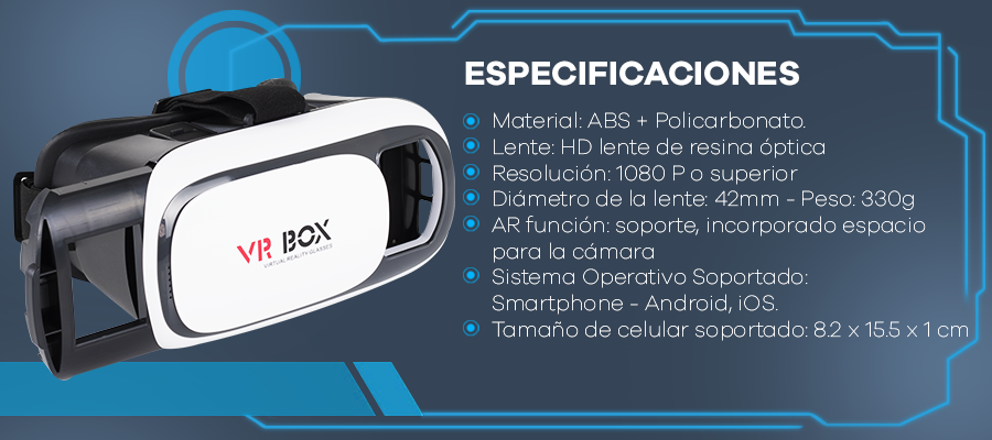 VR-Pro Box funciona con cualquier smartphone con sistemas operativos IOS y Android. Cuenta con unos lentes biconvexos los cuales permiten brindar una experiencia única de realismo al momento que se coloca el smartphone a una distancia adecuada de los lentes y se reproduce una aplicación de realidad virtual.